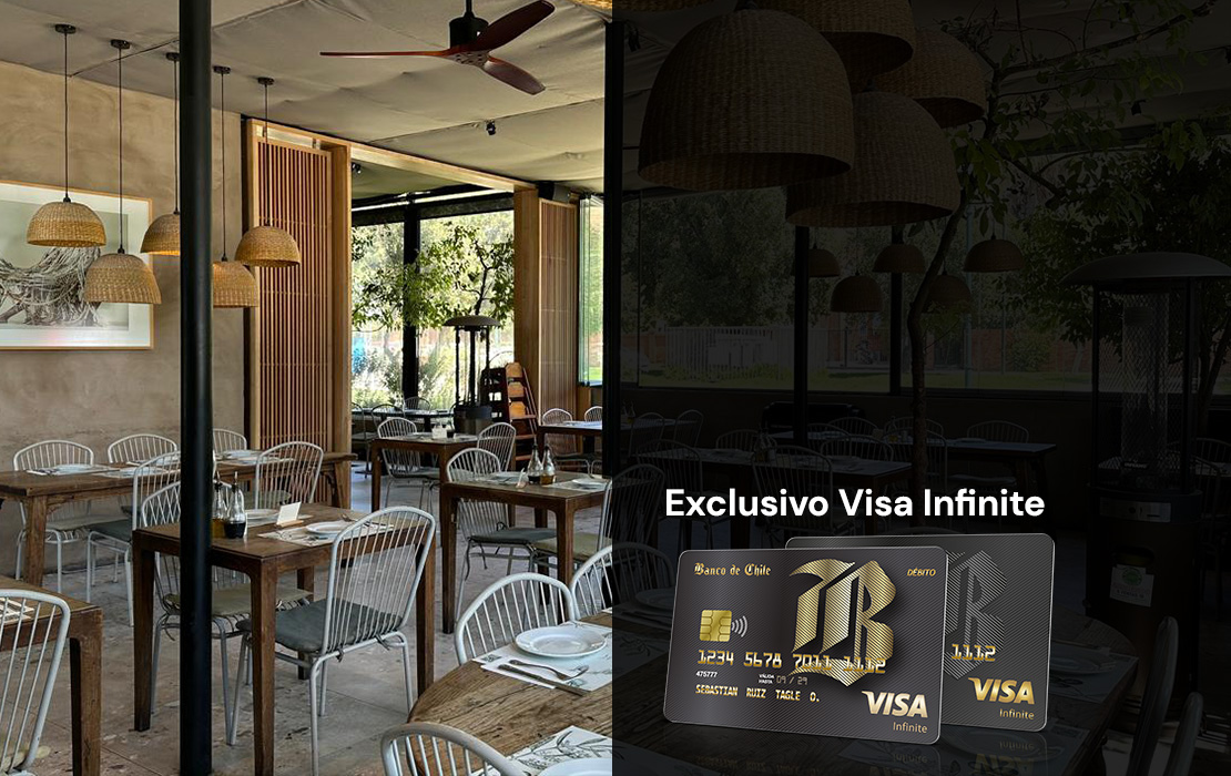Promoción válida desde el 01 al 30 de abril de 2026. pagando con Tarjetas de Crédito y Débito VISA INFINITE del Banco de Chile y Banco Edwards. Tope de descuento máximo $65.000 por mesa. No incluye propinas, happy hours, menús ni cigarrillos. Descuento no acumulable con otras promociones. Descuento es de exclusiva responsabilidad del restaurant no cabiéndole a Banco de Chile responsabilidad alguna en ello, ni la ulterior atención que ello demande.