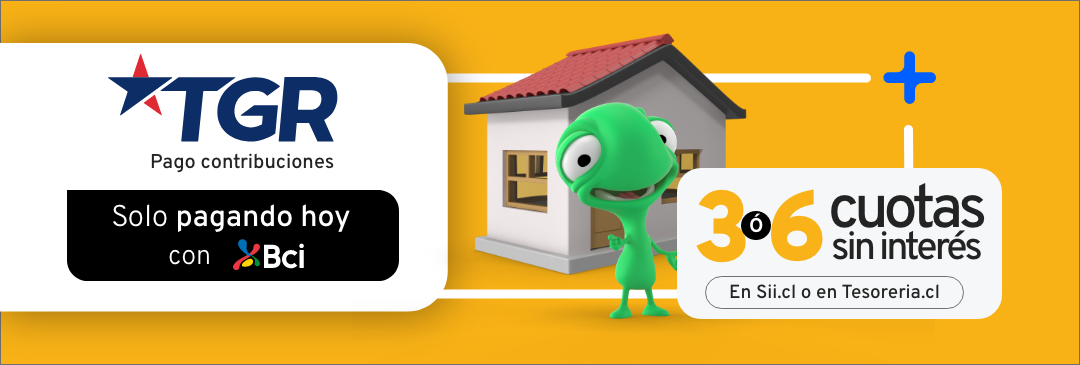 Paga tus contribuciones con tu Tarjeta de Crédito Bci, en 3 o 6 cuotas sin interés. CAE es del 1,36% para una compra de $400.000 en 6 cuotas, resultando en un costo total de $401.587 Esta campaña es válida desde el 1 de abril hasta el 30 de abril de 2026 para todas las Tarjetas de Crédito Bci vigentes.